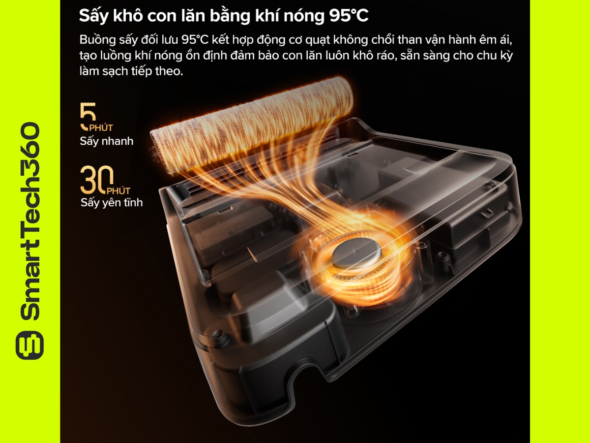- Dock vệ sinh nâng cấp – Giặt con lăn bằng nước nóng 90°C, sấy khô nhanh, hạn chế mùi ẩm mốc; Dreame và Tineco chỉ sấy ở 55–70°C.