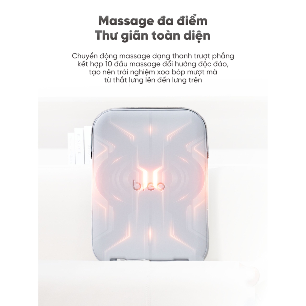 | Cơ chế hoạt động | Thanh trượt tịnh tiến + 10 đầu massage (Mô phỏng vuốt dọc sống lưng) | Xoay 3D với 6 điểm chạm (Tập trung ấn huyệt vùng eo) | Xoay 3D với 4 đầu massage (Xoa bóp vùng cổ vai) |