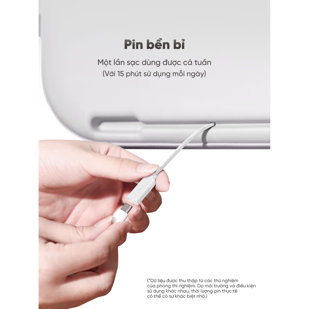 - Thời lượng pin bền bỉ: Một lần sạc đầy có thể sử dụng liên tục trong cả tuần (với tần suất 15 phút/ngày), giúp người dùng yên tâm mang theo trong các chuyến công tác hay du lịch.