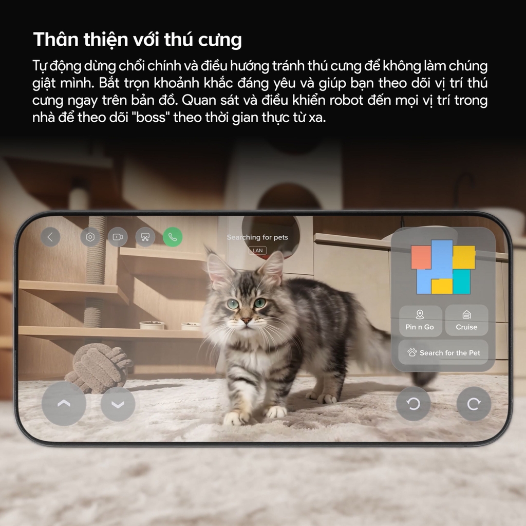 Hệ thống Reactive AI 3.0 không chỉ tránh đồ đạc mà còn nhận diện được thú cưng. Robot sẽ tự động dừng chổi chính và điều hướng sang hướng khác để tránh làm các "boss" giật mình. Bạn cũng có thể dùng App để gọi video call và tìm mèo trốn trong gầm giường.